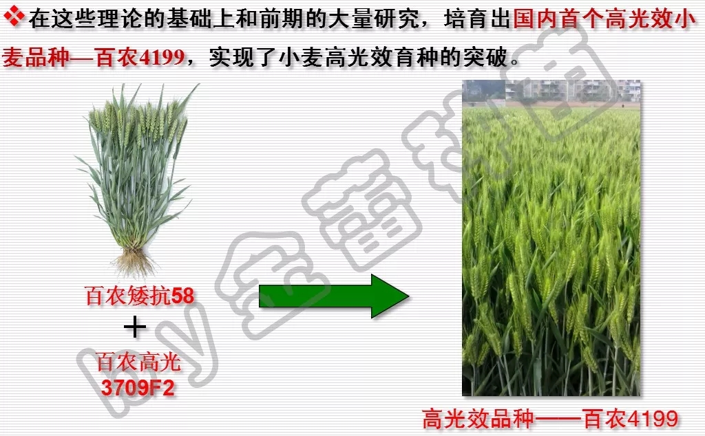 目標實施:茹振鋼教授科研團隊在全球采集小麥樣本,選擇了200個研究樣本進行對比。經過3年研究,他發現靠近地球兩極的小麥耐弱光,葉片薄、葉片顏色黑;靠近赤道的小麥耐強光,葉片厚、葉片顏色淺。于是將兩者通過基因育種工程等科學技術手段相結合,培育出了葉片既厚且顏色深的國內首個小麥高光效親本百農高光3709F2 。 它可最大程度地利用陽光,增強了小麥的光合作用。