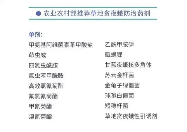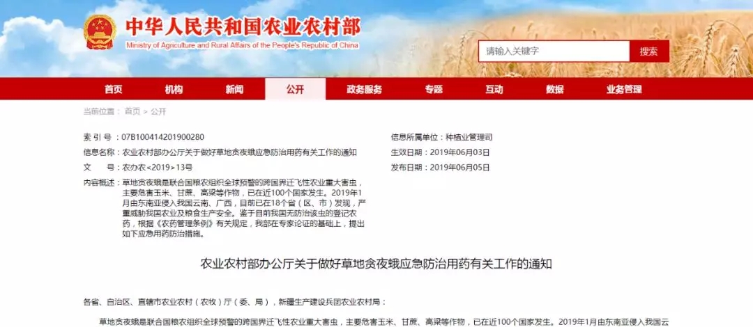 近日,農業農村部發布《農業農村部辦公廳關于做好草地貪夜蛾應急防治用藥有關工作的通知》(下稱“《通知》”),發布草地貪夜蛾應急防治用藥名單,暫定應急用藥時間自2019年6月3日至2020年12月31日。
