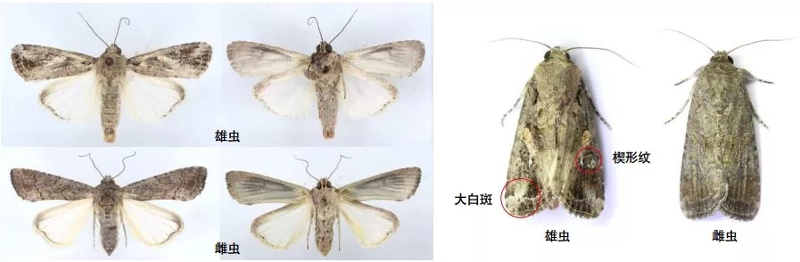 成蟲:翅展 32 ~ 40m m , 前翅深棕色,后翅白色,邊緣有窄褐色帶。雌蛾前翅呈灰褐色或灰色棕色雜色,具環形紋和腎 形紋,輪廓線黃褐色;雄蛾前翅灰棕色,翅頂角向內各具一大白斑,環狀紋后側各具一淺色帶自翅外緣至中室,腎形紋內側各具一白色楔形紋。