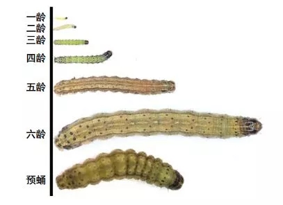 幼蟲:一般有 6 個齡期,體長 1 ~ 45m m , 體色有淺黃、淺綠、褐 色等多種 , 最為典型的識別特征是末端腹節背面有 4 個呈正方形排 列的黑點,三齡后頭部可見的倒 Y 形紋。